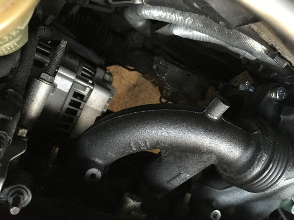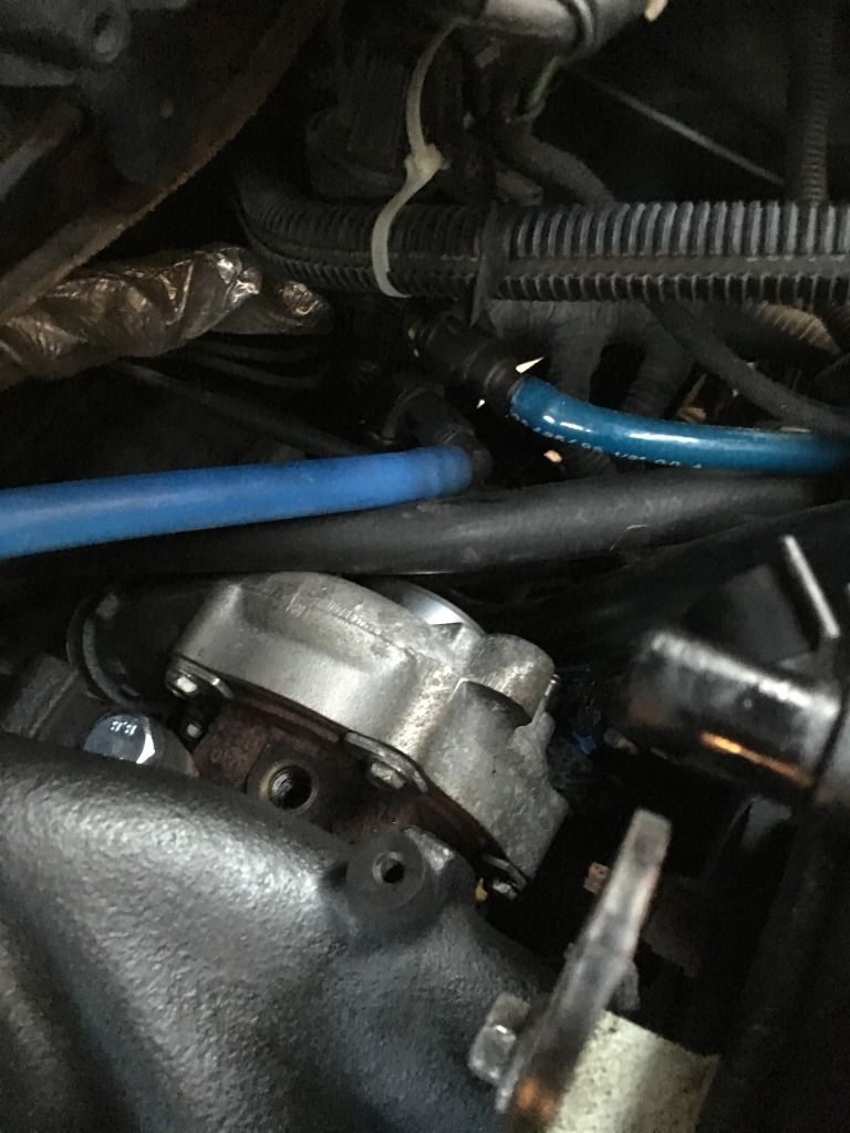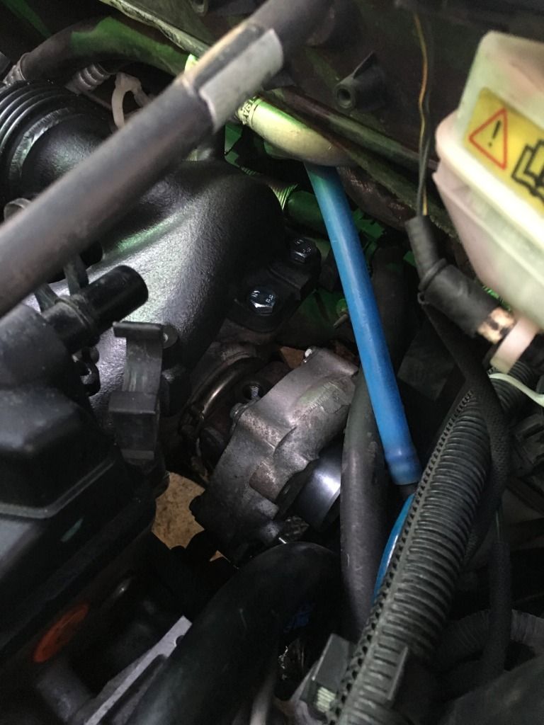 I was able to test fit the manifold and turbo on my built engine in my garage, and it fits nicely save for the fact that the mazdaspeed flange to the engine has more bolt holes than the focus head itself. Shouldn't be a big deal. After seeing the setup on the stand, I had to see if it would fit in the car. Since my dad is in Alaska on a business trip for a week, he left his truck with me. With something else to drive, I pulled the exhaust manifold off my car and test fit the manifold and turbo. It fits well, but quite snugly, I'm going to have to move some things to make it more comfortable (heater hoses resting on compressor housing and the like... Just tidy it up to look more stock)
